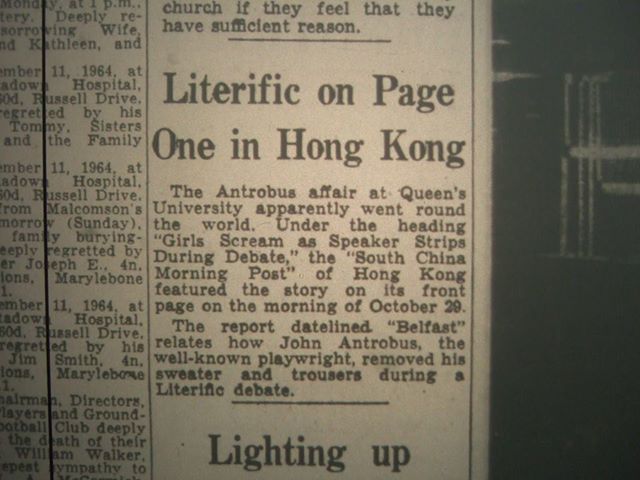 John Antrobus, the famous playwright and Carry On writer, stripped off in front of the Literific, leading to the society being disbanded by the SRC for several weeks. Word of this incident spread as far as Hong Kong. An account of the incident appeared on page 1 of the South China Morning Post. In a less spectacular episode several months later, McCann himself stole bottles of wine from the Botanic Inn and was suspended for a week from the university, leaving the Literific without a President at the AGM for the third year in a row.